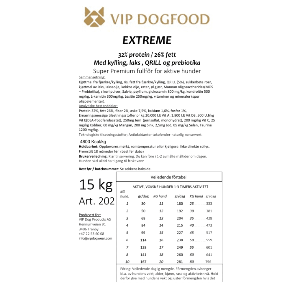VIP EXTREME er et unikt høy energi för pga sine ingredienser. Salvie som er betennelsesdempende, Psyllium for bedre fordøyelse og prebiotika for bedre dyrehelse og flere gode bakterier i tarmen.